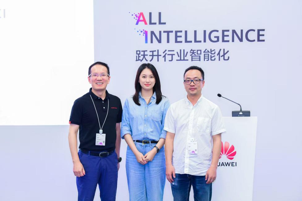 从左到右依次为:华为云媒体服务产品部部长吕阳明、e小融AI数字人原型胡融、央广网副总经理朱建勇