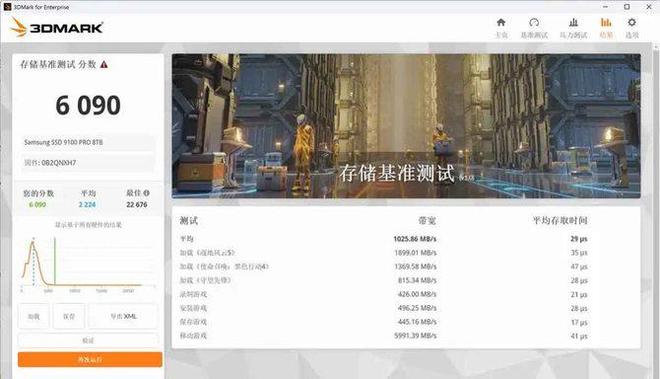 3DMark存储基准测试则模拟了实际游戏场景下的读写压力,9100 PRO 8TB取得了6090分的成绩,充分体现了其在大型游戏中复杂数据传输和多任务场景中的潜力。