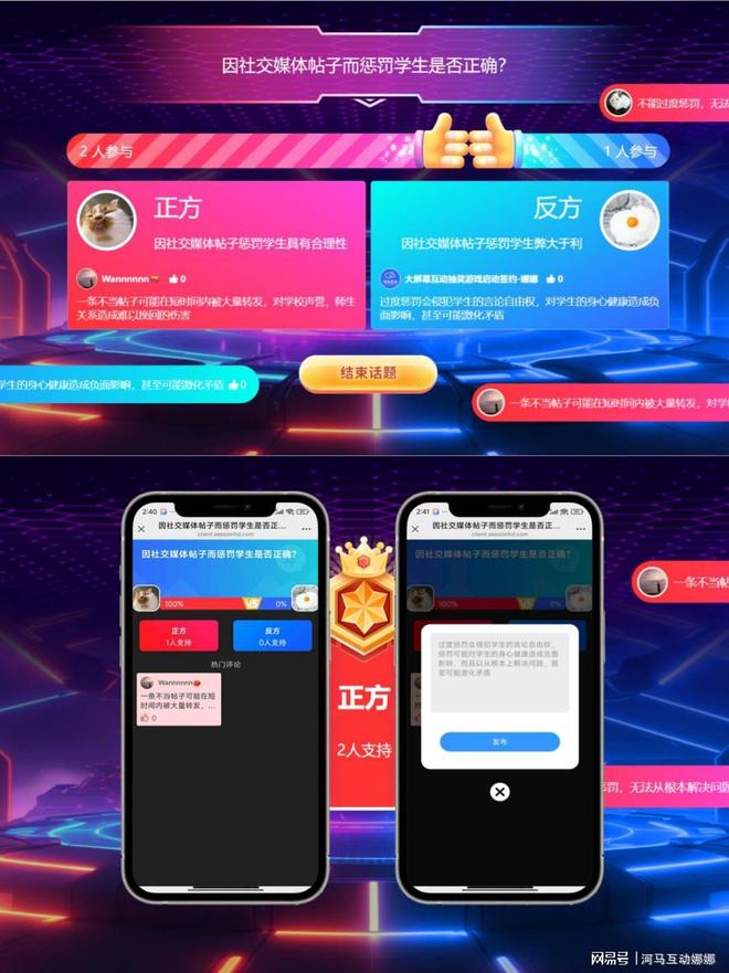 手机扫码参与的一款观点PK程序,1V1进行观点PK,手机扫码选择你的观点,大屏幕实时显示数据和热评,后台设置是否可以发表看法以及是否对看法进行点赞
